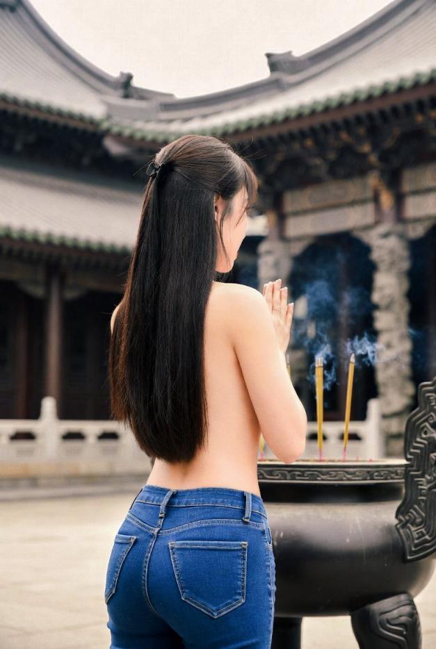 她抬起头,转过身,目光越过肩头,嘴角勾起一抹近乎顽皮的笑。身后是空荡荡的厅堂,唯有风吹过梁柱的低吟。她知道此刻无人,却仍旧像被千百双眼睛注视——那种被窥视的战栗,反而让下腹涌起一阵湿热。牛仔裤的布料紧贴着她,勒出臀部的圆润弧线,裤缝间已隐隐渗出潮意。